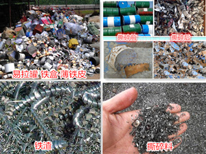 油漆桶撕碎机将各种废旧金属罐体,例如露露灌、六个核桃罐、啤酒易拉罐、红牛饮料罐、八宝粥罐、和其正罐、白酒外包装铁盒、可乐罐、油漆桶、废薄铁皮、废铁渣、罐头盒等各种废旧金属罐体破碎成团状颗粒,从而减少运输成本,并提高废铁投炉炼铁得速度。