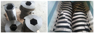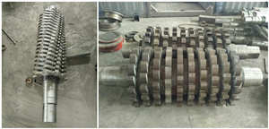主轴有两端轴承支撑,电机经齿轮箱传递给主轴,旋转的主轴带动螺旋排列的刀具,主轴的旋转带动刀具啮合,将物料撕碎,完成切削任务。电控部分安装有倒转自动控制装置,克服因塞料卡机的难题。为提高使用寿命和切削能力,主轴和刀具均经过调质处理。